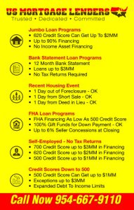 FHA/VA MORTGAGE PROGRAMS – 3.5% Down with a 580 fico. 100% VA financing with a 580 fico. FHA/VA Manual Approvals when your bank says NO! We say Yes! Purchase 3 years after Foreclosure, 2 years after a Chapter 7 Bankruptcy. 12 months after a Chapter 13 bankruptcy.